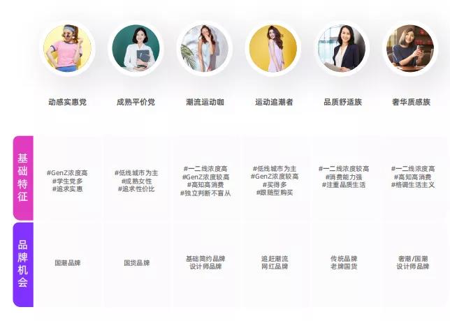 全球疫情为品牌、零售商和消费者带来众多不确定性,服饰中加入户外元素成为给日常生活带来安全感、舒适感的关键设计,消费者希望产品适应性强,且具备美观性和实用性,同时能够支持全天活动;天猫淘宝女装/内衣/女鞋和运动融合逐渐增强,界限感削弱。据统计,女装和运动户外鞋服的交集消费者占比提升了14%,内衣和运动户外鞋服的交集消费者占比提升了12%,女鞋和运动户外鞋服的交集消费者占比提升了15%;伴随女性自我意识的不断觉醒,加速催生了契合消费者多维需求的轻运动赛道,女装/内衣/女鞋MAT21年轻运动消费者规模近2亿,渗透空间巨大。2020年,阿里生态内的Z世代已占据30%时尚消费份额,同比2019年增速高达106%,高于整体时尚消费大盘整体增速(91%)。轻运动赛道内GenZ浓度更高,用户价值远高于行业大盘人群,尤其是在女装/内衣、女鞋品类的消费力。按照用户特征和决策风格,可划分出六大人群:动感实惠党、成熟平价党、潮流运动咖、运动追潮者、品质舒适族、奢华质感族。轻熟、无偏向、休闲风格是用户关注首选,酷感是用户风格表达核心。嘻哈街头、中国风、朋克摇滚易与青年党沟通,简约、雅痞则易与潮流时尚者沟通。
